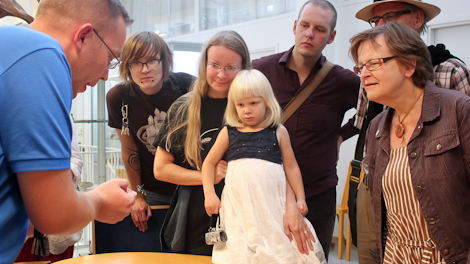 Ilari Sääksjärvi esitteli trooppisia hyönteisiä Leena Repolle, Juha Matulalle, Minea ja Miina Nurmelle sekä Katariina Kyylle.
