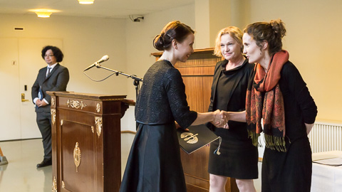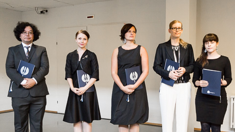 Palkinnon saajat: FT Nobufumi Inaba (vas.), FT Heidi Luoto ja FT Elina Rantanen. KTT Frederick Ahenin palkinnon otti vastaan hänen vaimonsa FT Outi Salo-Ahen ja oikealla viimeisenä FT Heta Mulari.